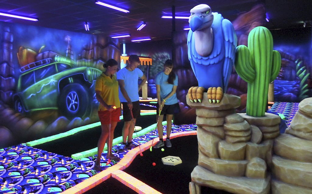 Schlag ein Hole-in-One bei GlowGolf® Weert und reise durch eine magische Glow-in-the-Dark-Welt. Lass deinen Ball an riesigen 3D-Elefanten vorbeirollen, schwing dich an Erdmännchen, Meerjungfrauen und Kamelen vorbei – durch Prärie, Dschungel und einen vergessenen Tempel. Perfekt für Familien, Freunde oder Kindergeburtstage. Noch nicht genug Abenteuer? Kombiniere dein Minigolf-Erlebnis mit der spannenden EscapeBox – einem Escape Game voller Rätsel – oder tauch ein in die Magie unseres 3D-Kinos. GlowGolf Weert befindet sich im Ferienpark Landal Weerterbergen.